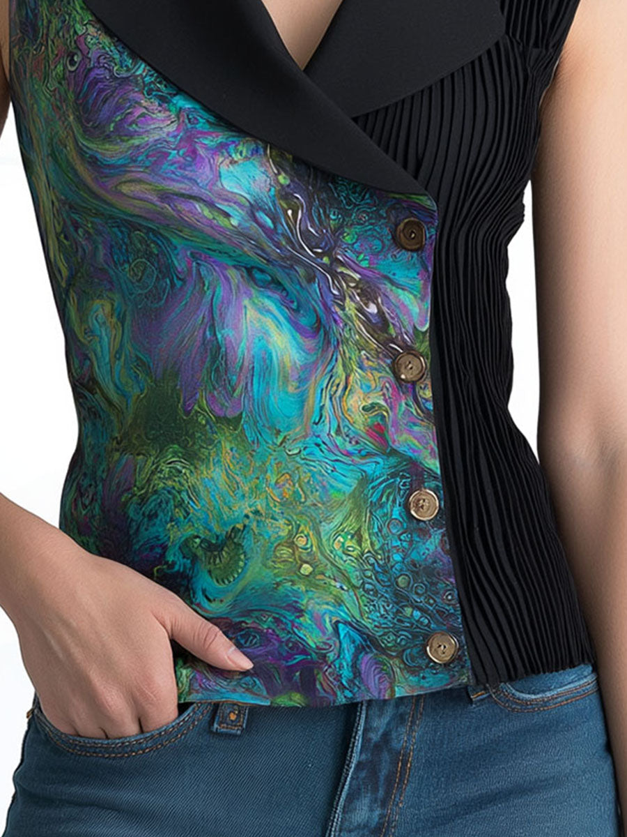 Dieses asymmetrische Abstract Print Plissee-Top mit Blazerkragen ist eine perfekte Mischung aus modernem Stil und künstlerischem Flair. Das Top ist mit einem auffälligen abstrakten Druck gestaltet, der einen lebendigen Akzent in Ihre Garderobe bringt. Der Weste-Stil wird durch einen blazerähnlichen Kragen ergänzt, der einen Hauch von Raffinesse verleiht und es sowohl für legere als auch für semi-formelle Anlässe geeignet macht.