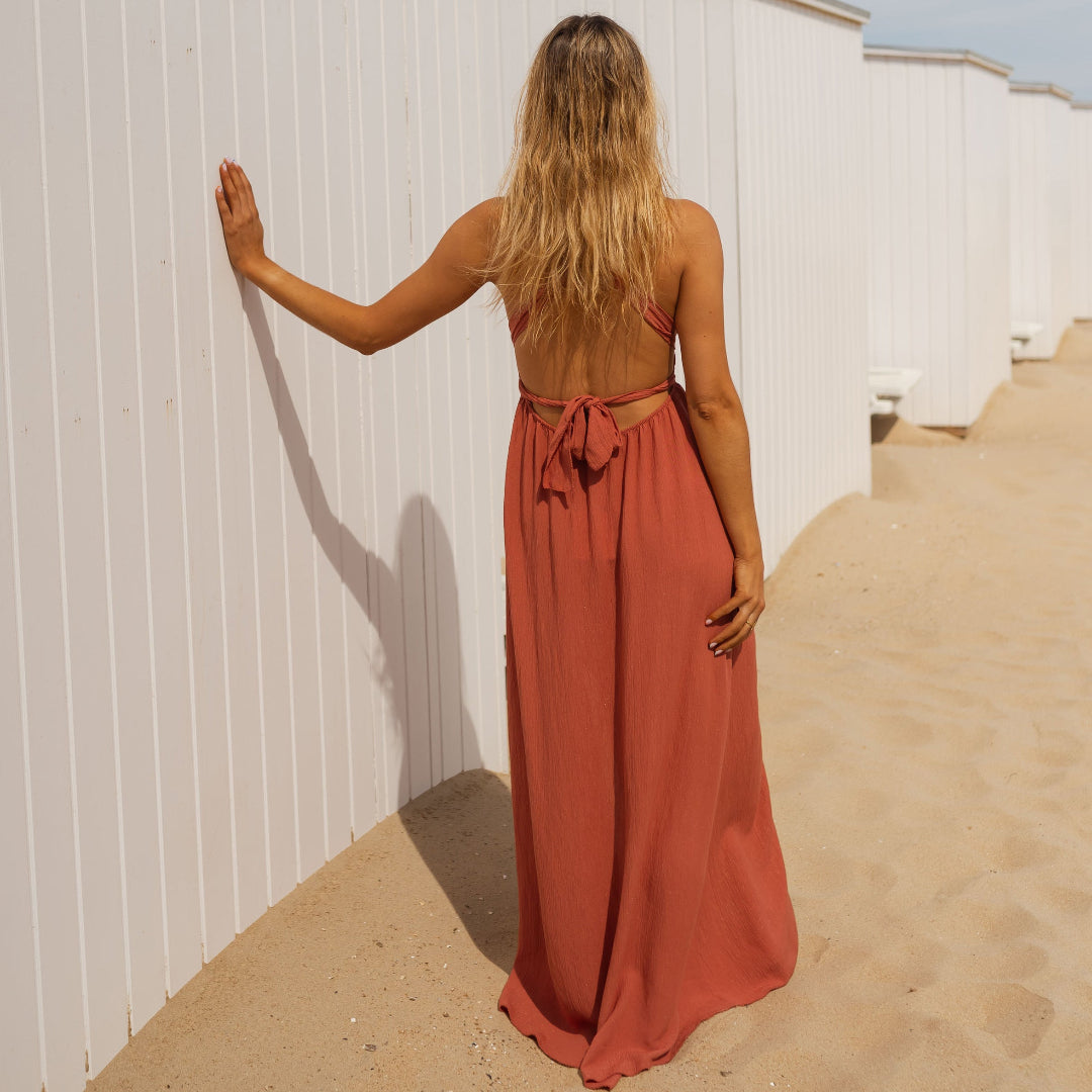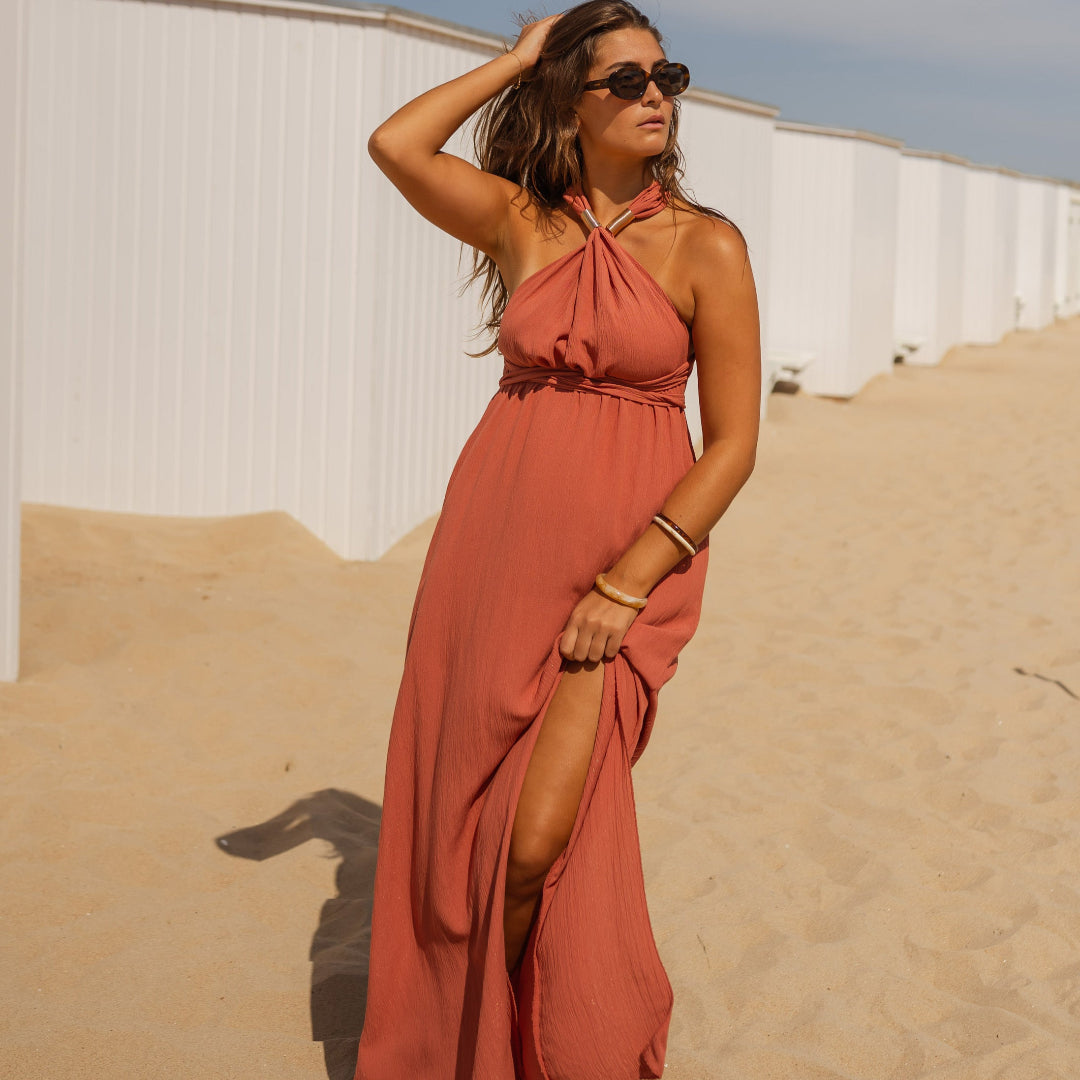 Veelzijdig, vrouwelijk en verleidelijk – de jurk voor veelzijdig gebruik biedt een verfijnde silhouet met een vrije rug en een vloeiende stof die elke beweging volgt. De gouden sierdetails op de bandjes geven een vleugje luxe.