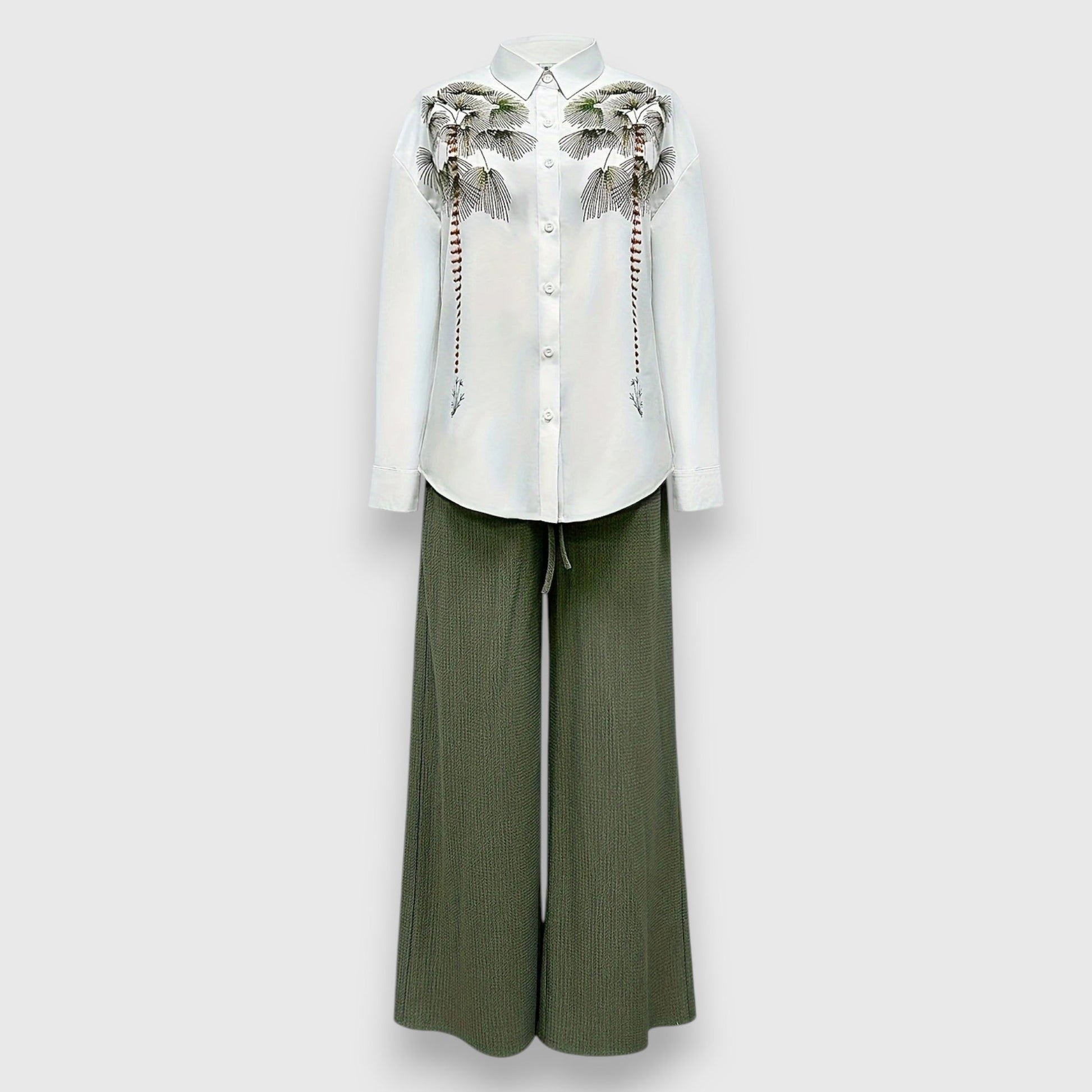 Das Nivana Set kombiniert eine elegante Bluse mit zartem Blumenmuster und eine fließende Hose mit weitem Bein – perfekt für stilvolle Tage. Der leichte Stoff und der hohe Kragen verleihen dem Ensemble eine feminine, anspruchsvolle Note.