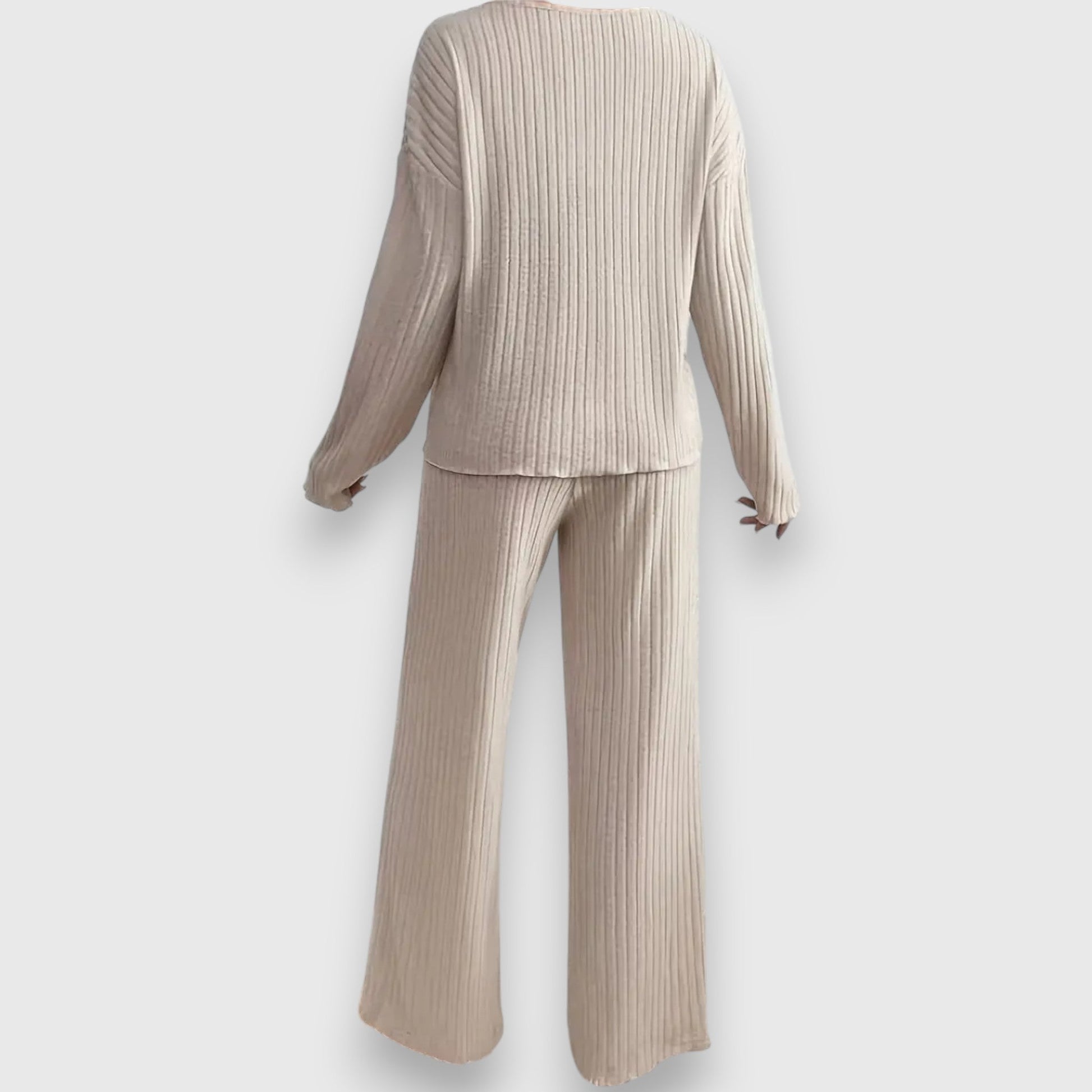 Gemütlicher Zweiteiler mit V-Ausschnitt und langärmeliger Passform. Perfekt für entspannte Tage im Frühling.