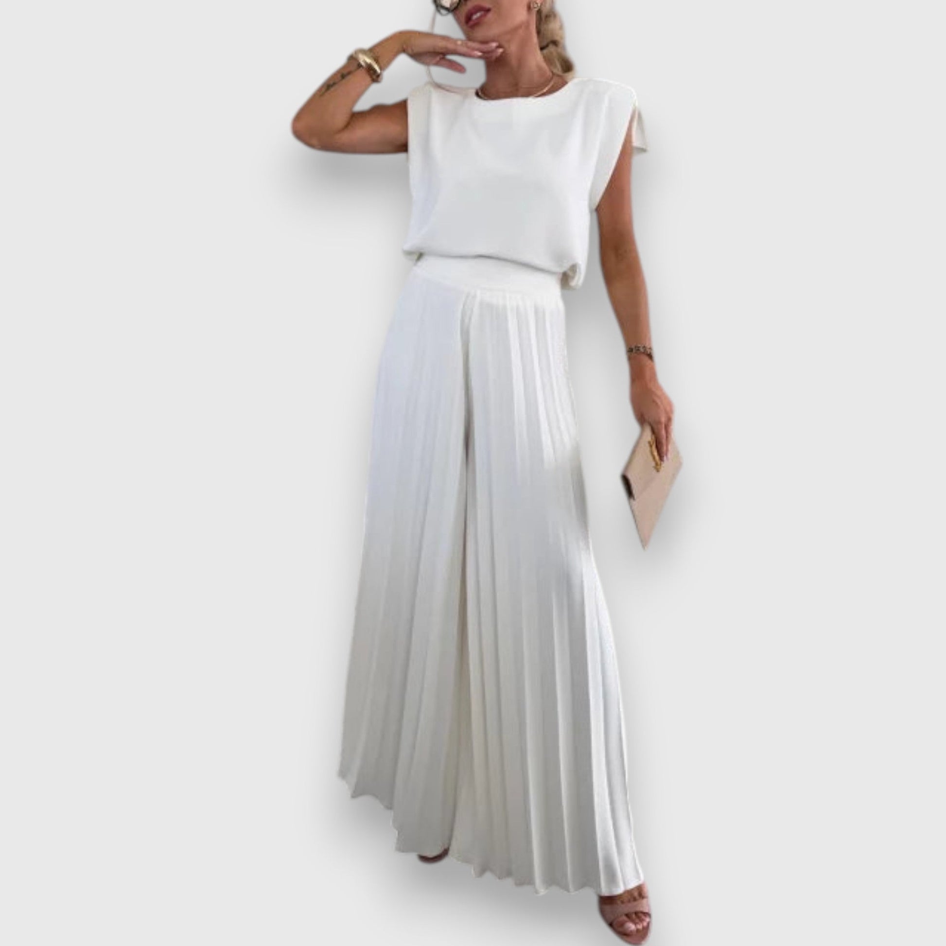 Das Manja Set überzeugt mit fließender Eleganz und modernem Stil – perfekt für besondere Anlässe, elegante Abendessen oder einen stilvollen Alltagslook. Der feminine Schnitt und die weich fallende Plissee-Hose sorgen für eine schmeichelhafte Silhouette mit maximalem Tragekomfort.