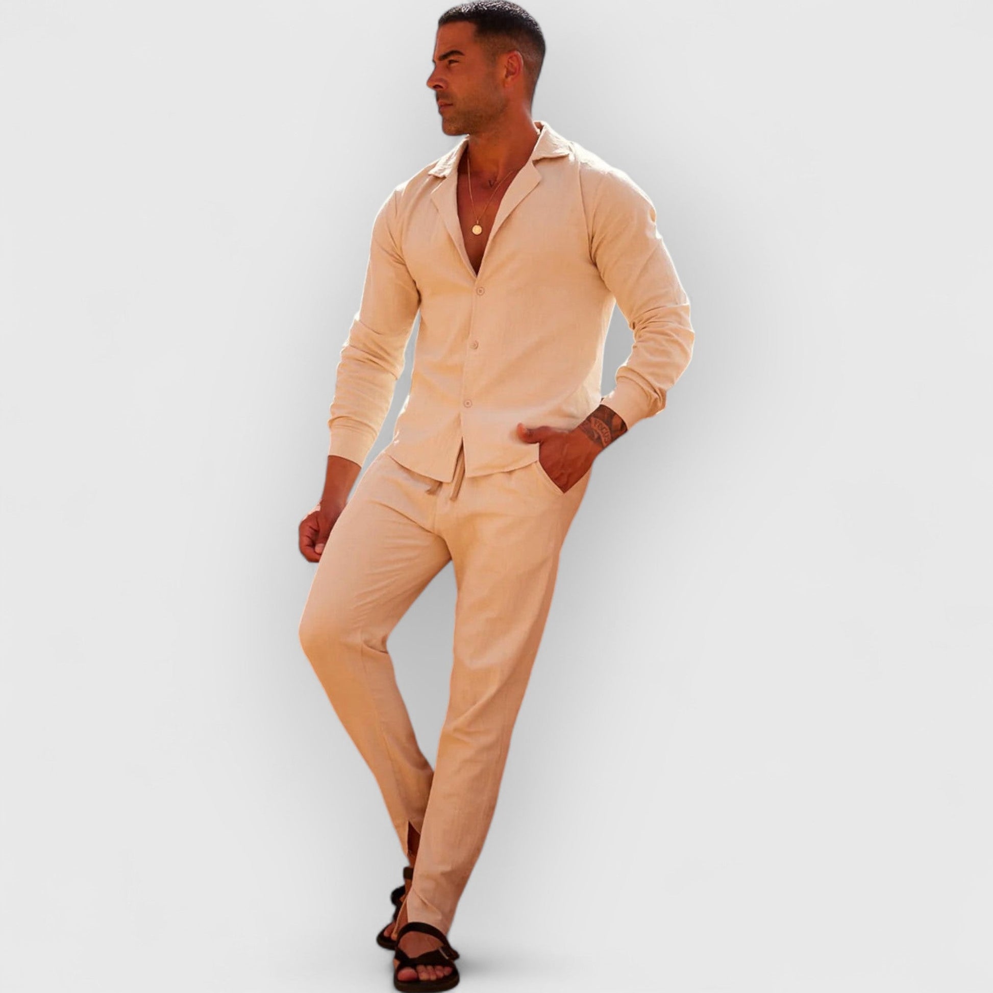 Das ROLD – Set aus Leinenoberteil und Hose vereint entspannten Komfort mit einem eleganten, sommerlichen Look. Aus hochwertigem Leinen gefertigt, bietet es ein angenehm kühles Tragegefühl und wirkt gleichzeitig edel und zeitlos. Ob für den Strandspaziergang, das Stadtcafé oder den Urlaub – mit diesem Set bist du immer stilvoll und bequem gekleidet.