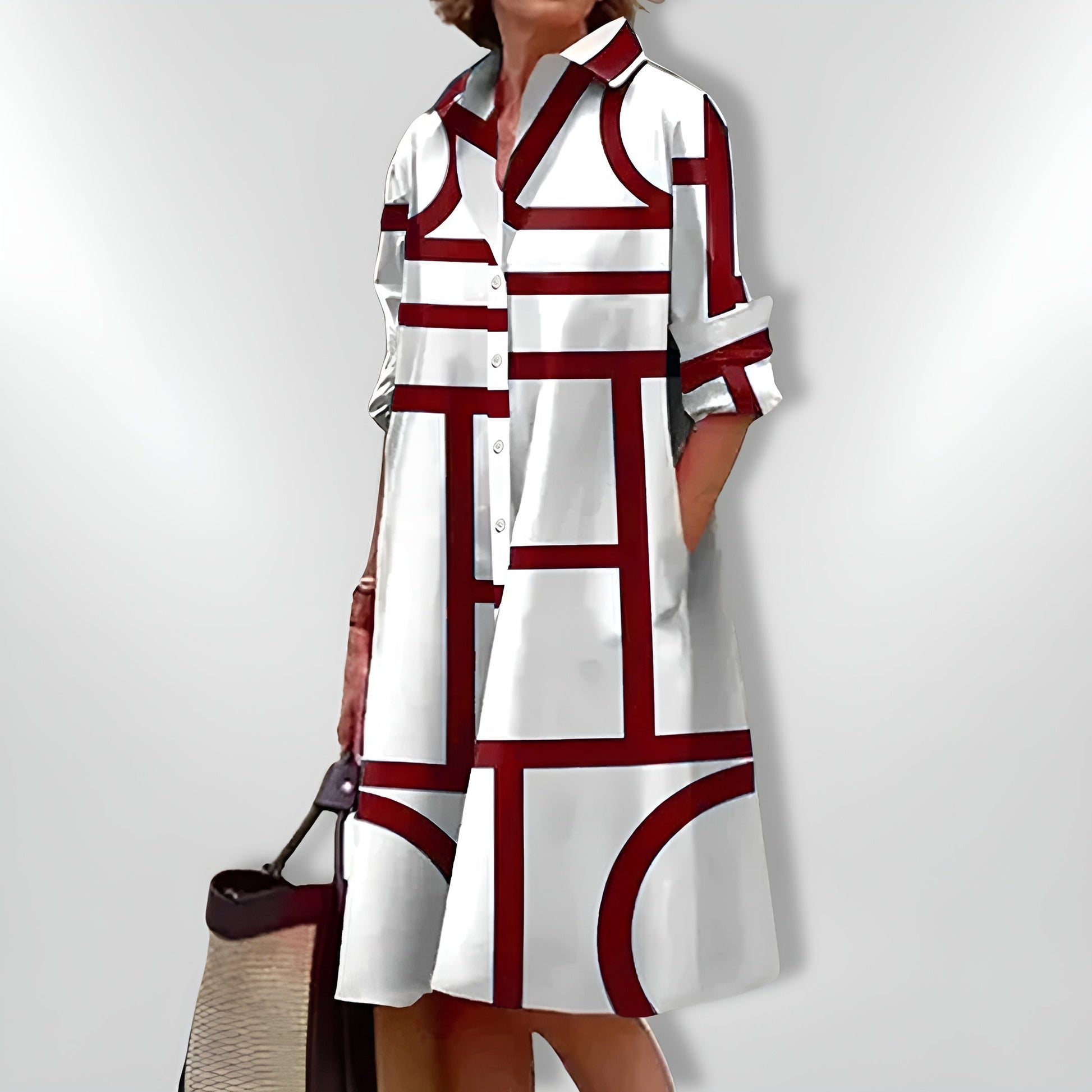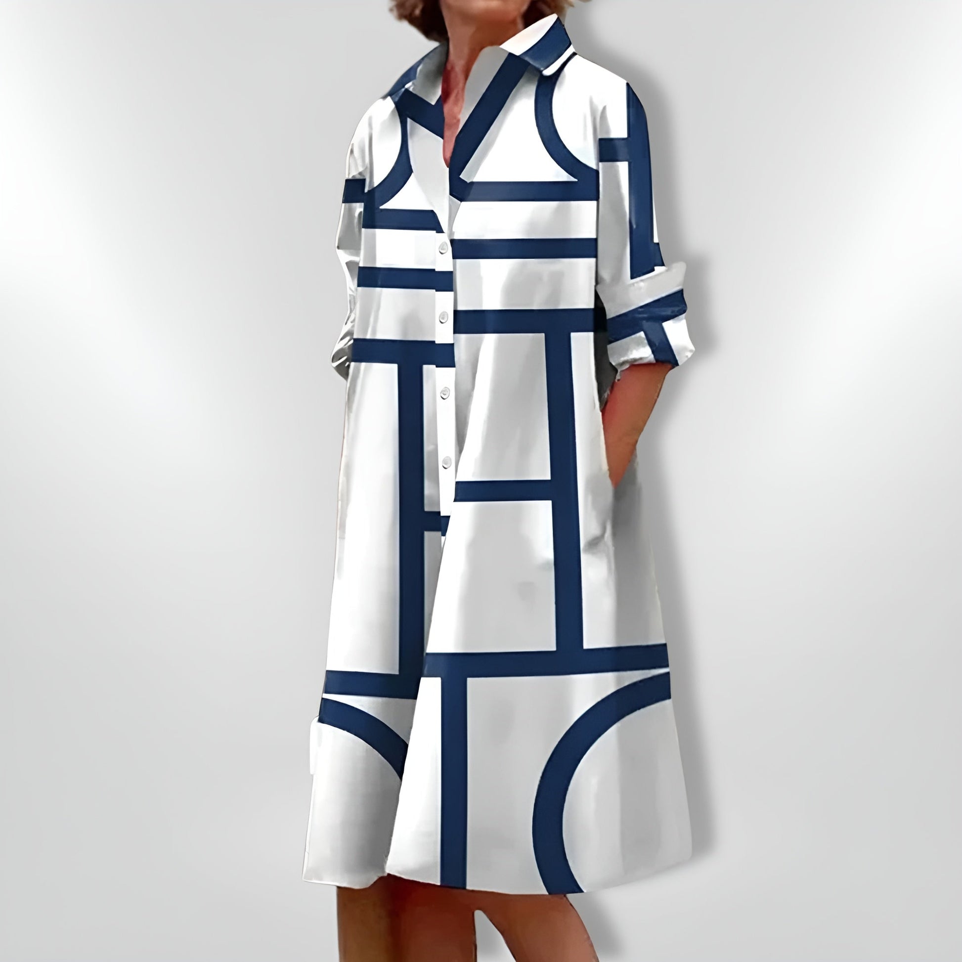 Das Silvia – Midikleid mit geometrischen Mustern überzeugt mit einem ausdrucksstarken Design und einem stilvollen, modernen Schnitt. Die markanten geometrischen Muster verleihen dem Kleid einen künstlerischen Touch und machen es zu einem echten Hingucker.