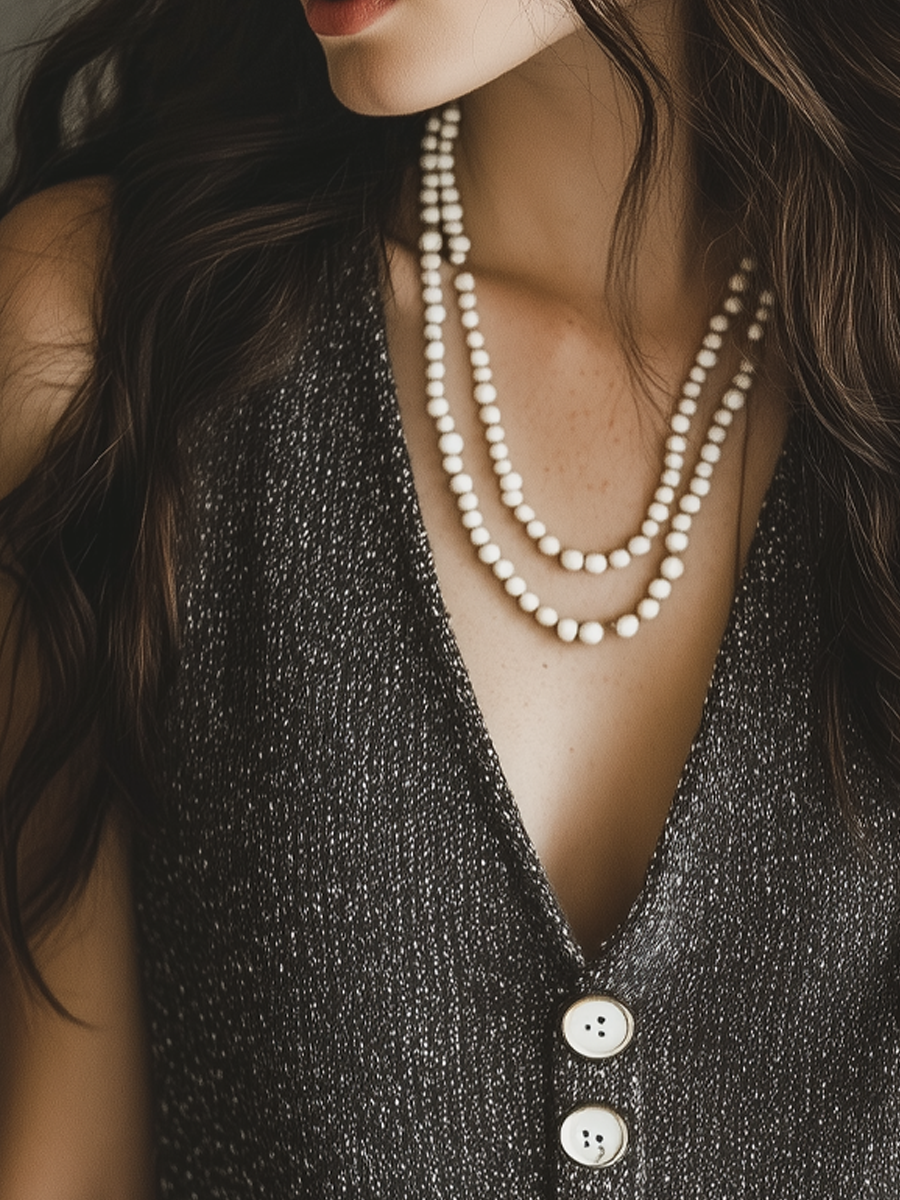 Kombinieren Sie diese Weste mit einem kontrastierenden weichen Stoff wie einem Baumwollhemd oder einer Seidenbluse, um ihre Textur zu betonen und ein ausgewogenes Outfit zu schaffen. Für einen gewagteren Look tragen Sie sie über einem einfachen Kleid oder mit Jeans, um ihren metallischen Glanz zu betonen. Fügen Sie minimalistische Accessoires hinzu, um den Fokus auf das filigrane Design der Weste zu lenken.